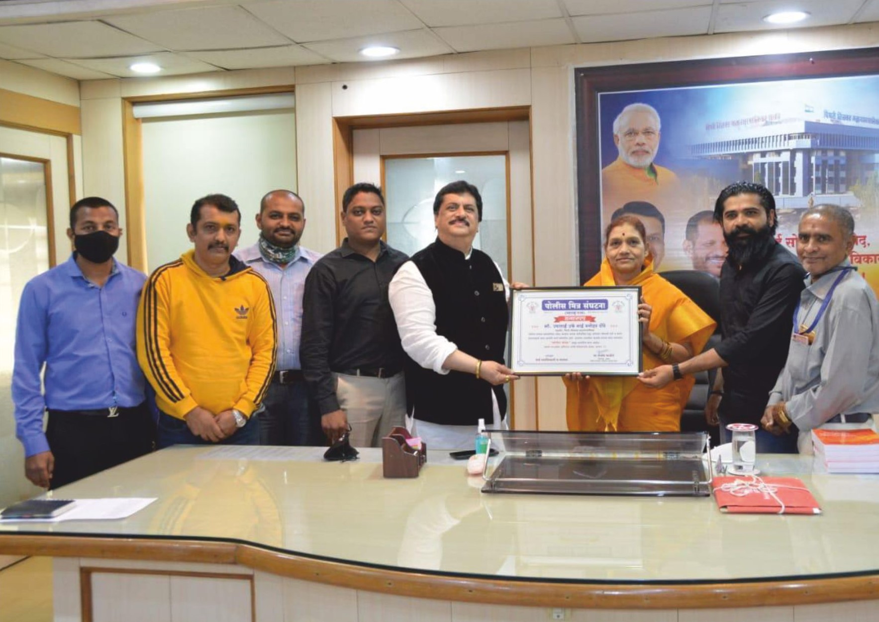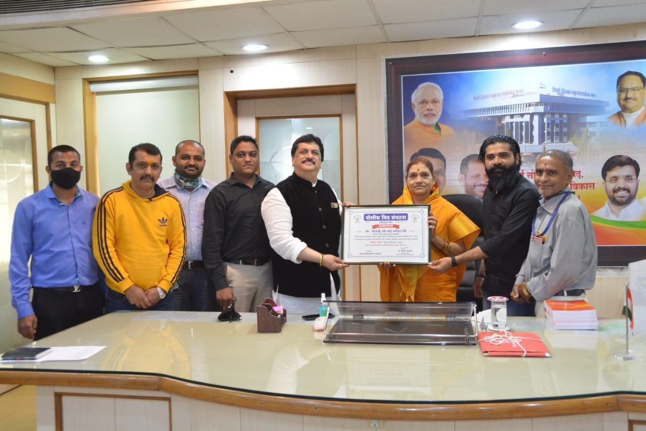 महापौर माई ढोरे याना कोरोना योद्धा सन्मान पत्र प्रदान करताना