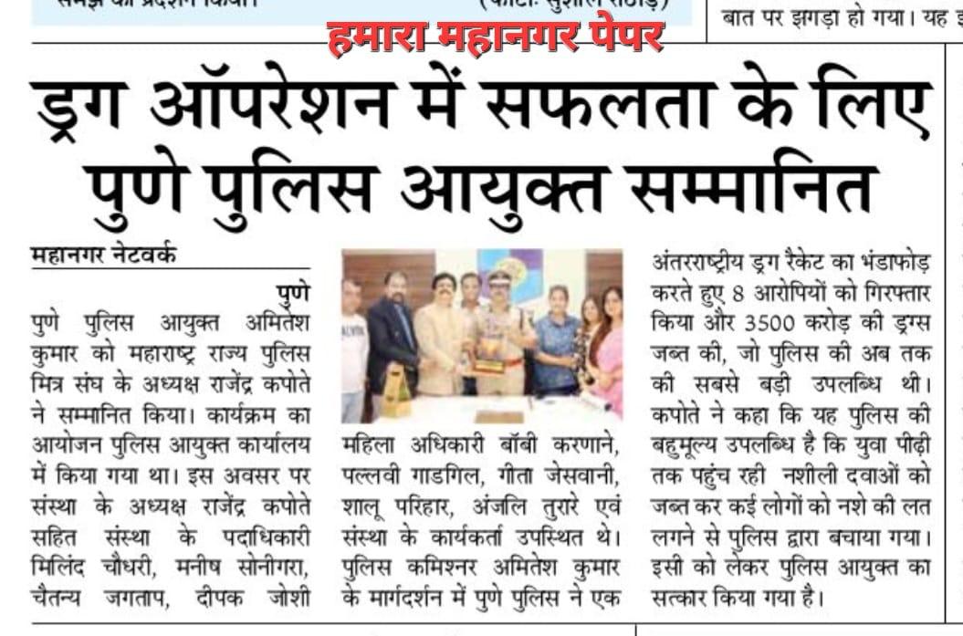 ड्रग ऑपरेशन में सफलता के लिए पुणे पुलिस आयुक्त सम्मानित