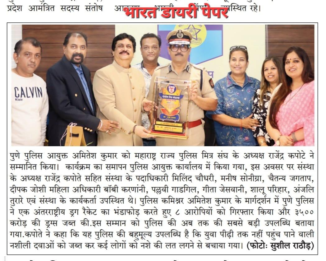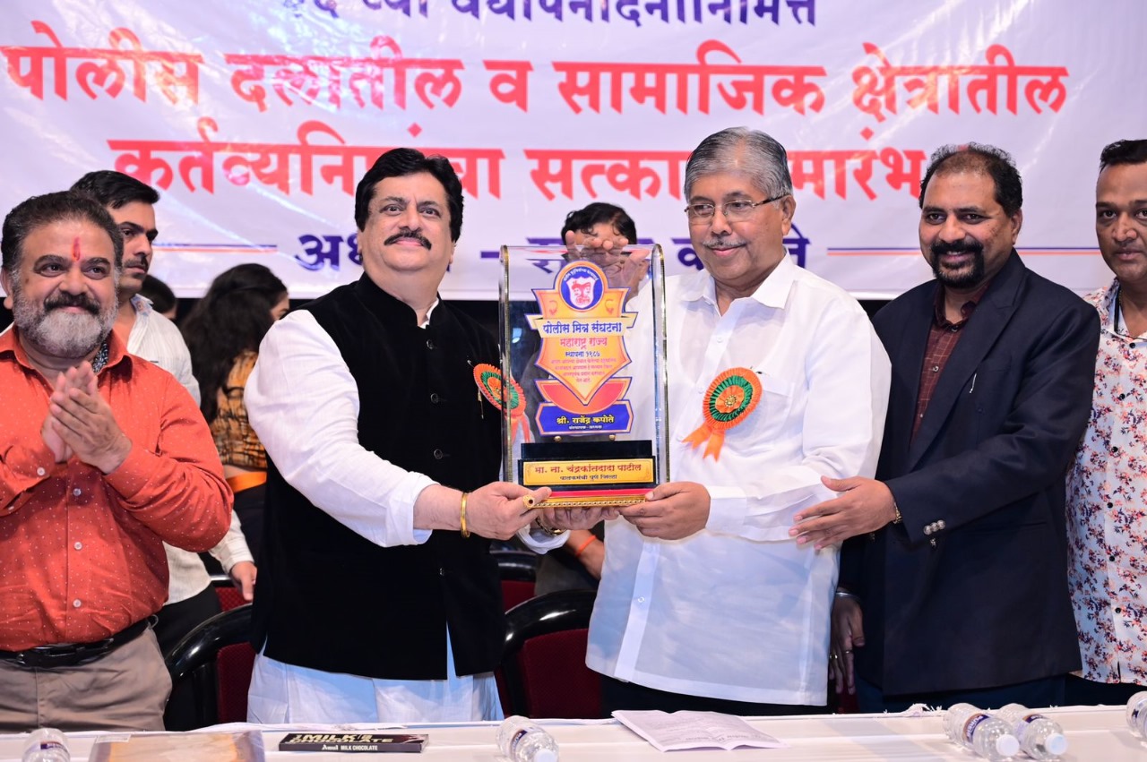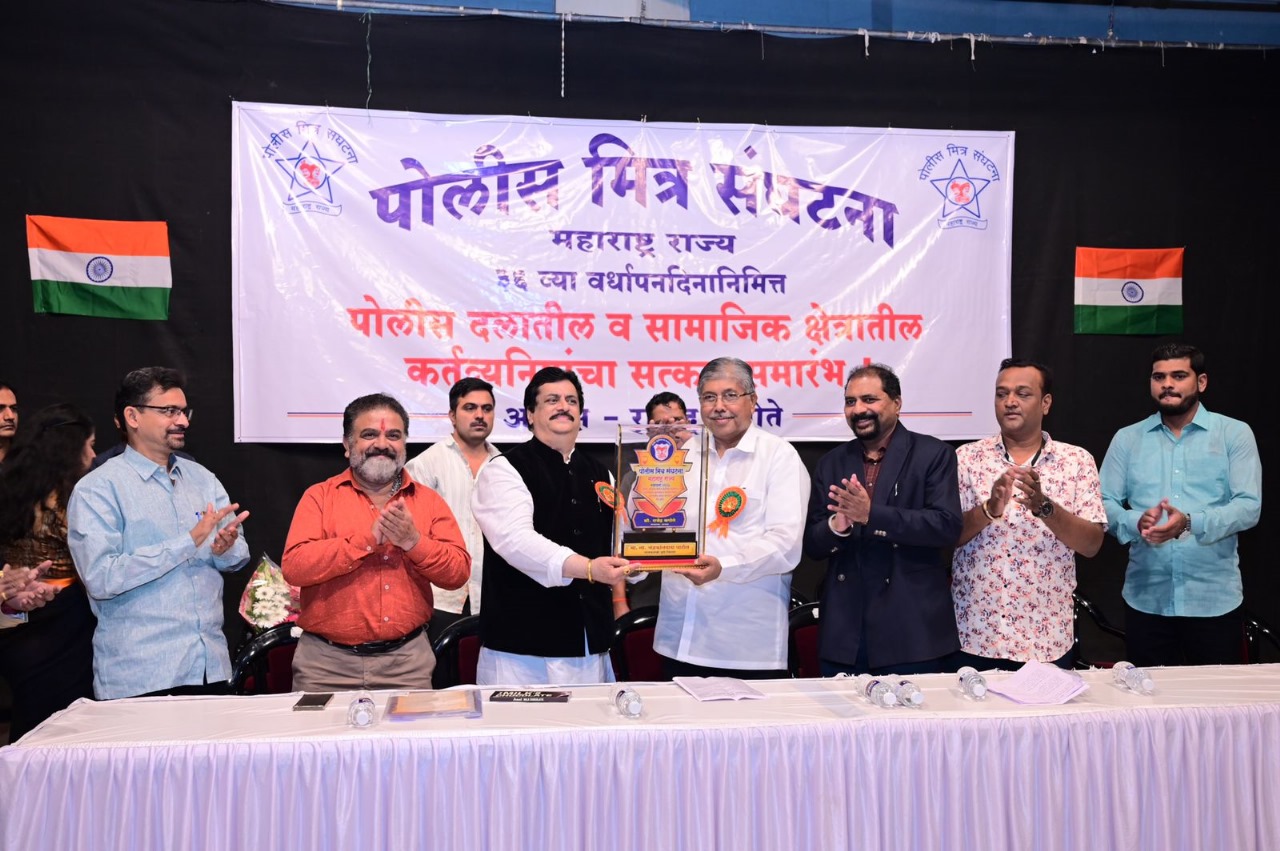 पुणे पुलिस आयुक्त अमितेश कुमार को महाराष्ट्र राज्य पुलिस मित्र संघ के अध्यक्ष राजेंद्र कपोटे ने सम्मानित किया। कार्यक्रम