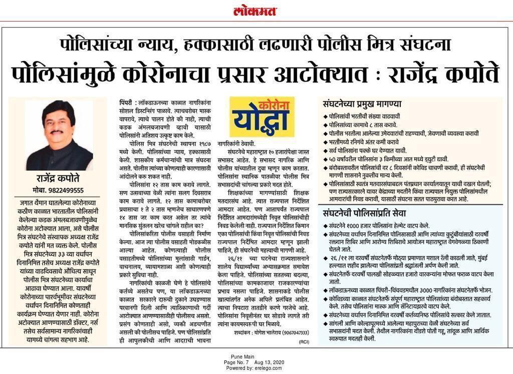 पोलिसांच्या न्याय, हक्कासाठी लढणारी पोलीस मित्र संघटना पोलिसांमुळे कोरोनाचा प्रसार आटोक्यात : राजेंद्र कपोते